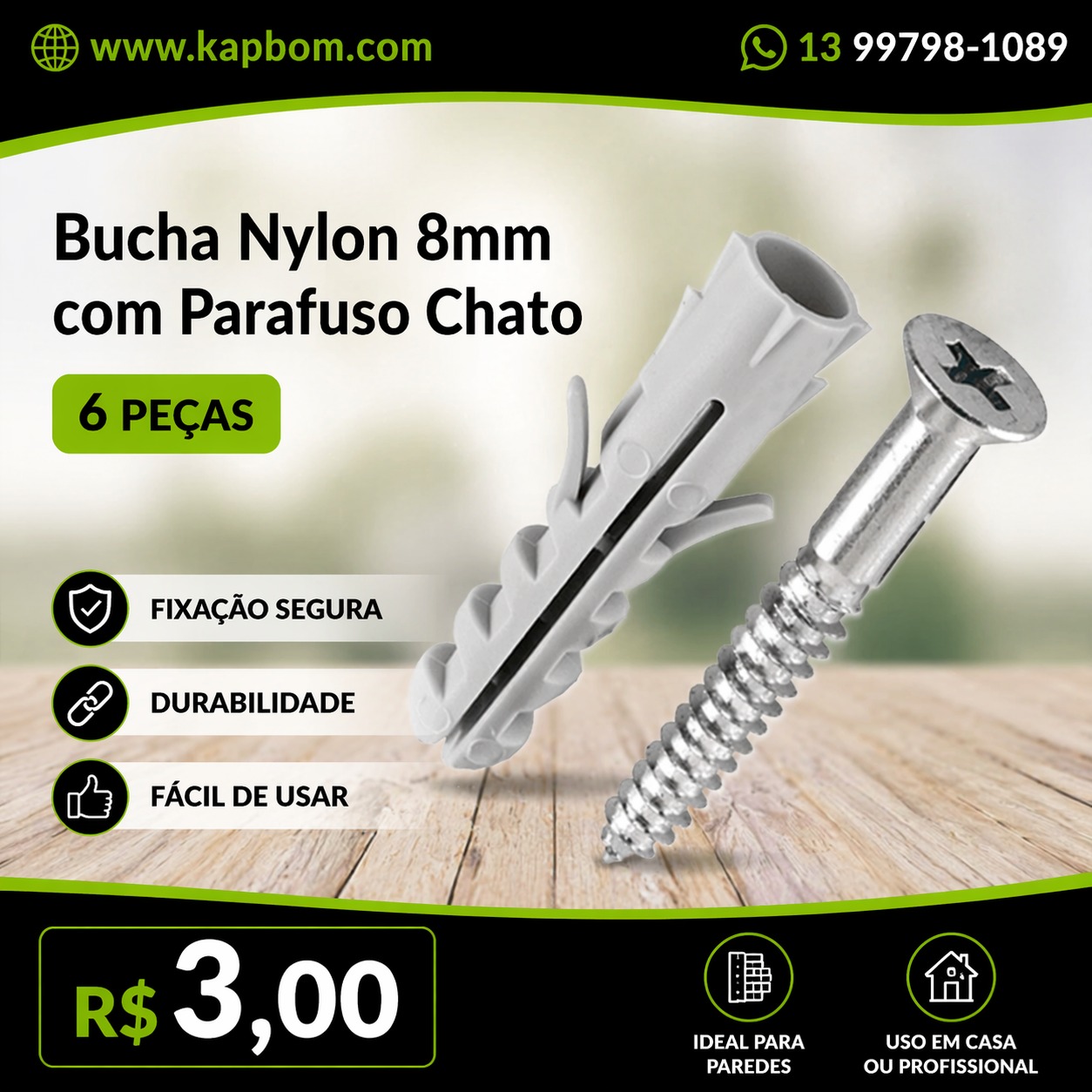 O kit com bucha de nylon 8mm com parafuso chato é ideal para fixações firmes e seguras em paredes de alvenaria, concreto e superfícies sólidas. Indicado para uso residencial e profissional, garante excelente desempenho em instalações diversas.